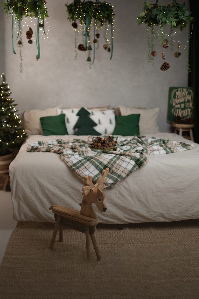Zapraszam do wyjątkowej scenerii, gdzie surowy industrialny klimat spotyka ciepło domowego relaksu. Betonowa ściana kontrastuje z miękkim łóżkiem pełnym kocyków i poduszek, tworząc idealne tło dla świątecznych, rodzinnych kadrów. Naturalne barwy- beże, brązy i zielenie, otulają przestrzeń spokojem, a zapach żywego drzewka i subtelne lampki wprowadzają prawdziwą magię świąt. Dzieci zachwyci uroczy drewniany renifer przy choince, gotowy na wspólne zabawy