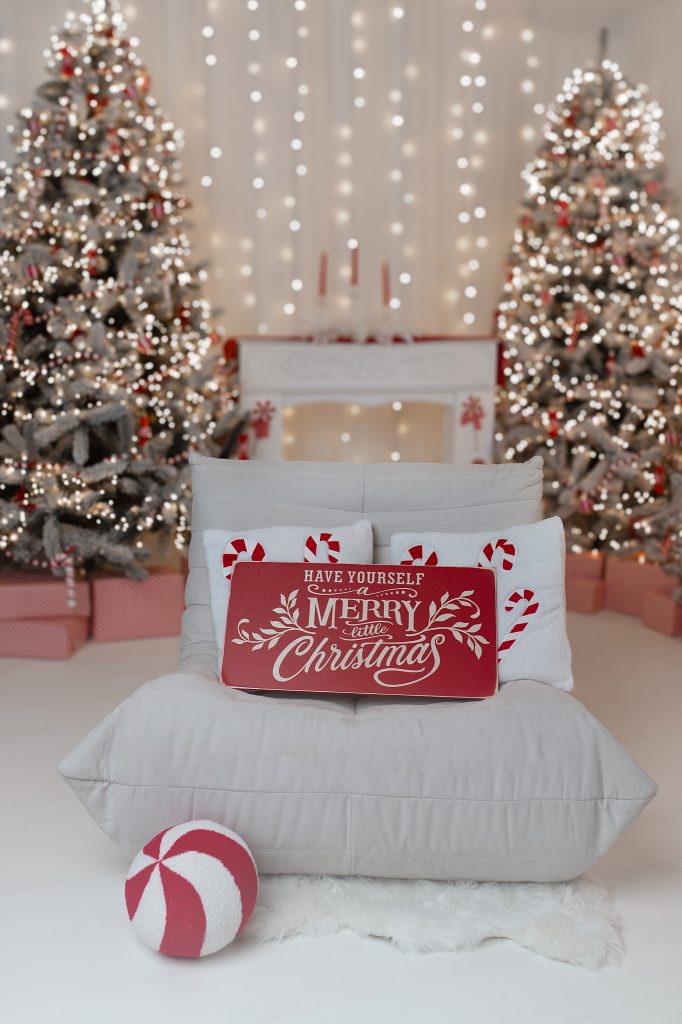 Jasna, pełna blasku sceneria otoczona majestatycznymi choinkami oprószonymi śniegiem, ozdobionymi ogromnymi czerwonymi kokardami i laskami cukrowymi. W blasku setek lampek czeka na Was mięciutki dywanik i komfortowa kanapa, idealne miejsce na rodzinne ujęcia. Dzieci zachwyci świąteczny stragan ze słodkościami, który wprowadzi odrobinę magii rodem z zimowego jarmarku. To wyjątkowa scenka, która łączy elegancję z ciepłem rodzinnych chwil pełnych radości, bliskości i świątecznej atmosfery.